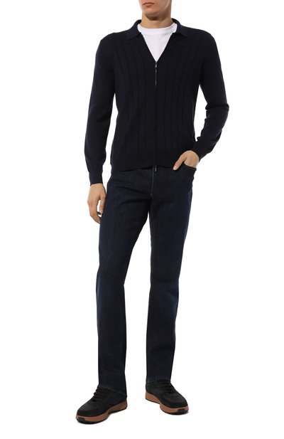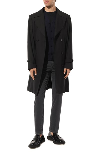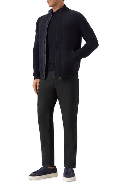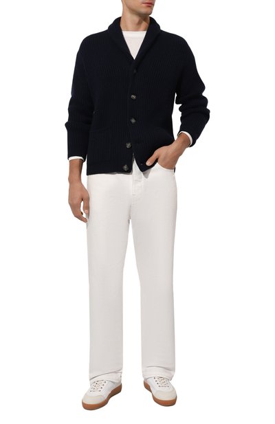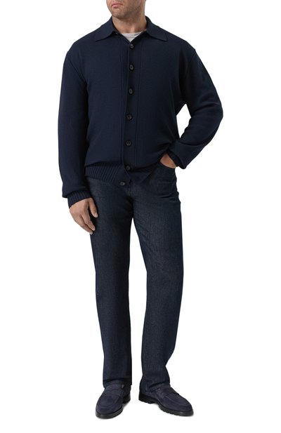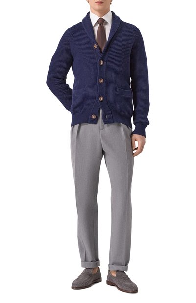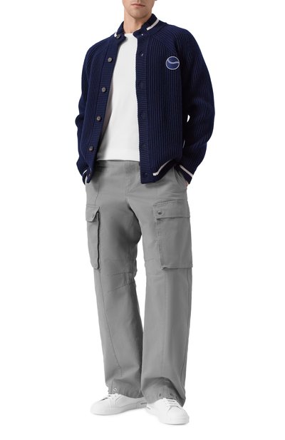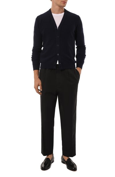 Кардиган с V-образным вырезом связали фактурным полосатым узором из тонкой шерстяной пряжи. Модель с рукавами реглан застегивается крупными пуговицами.