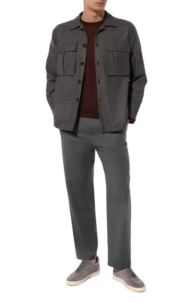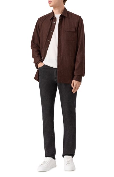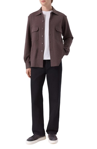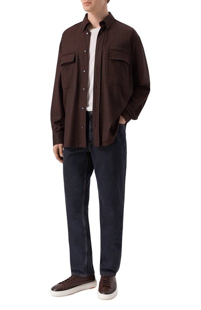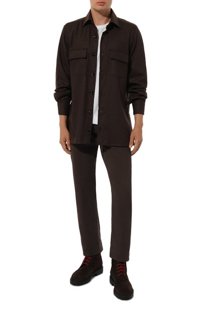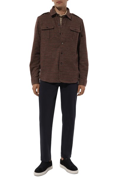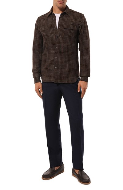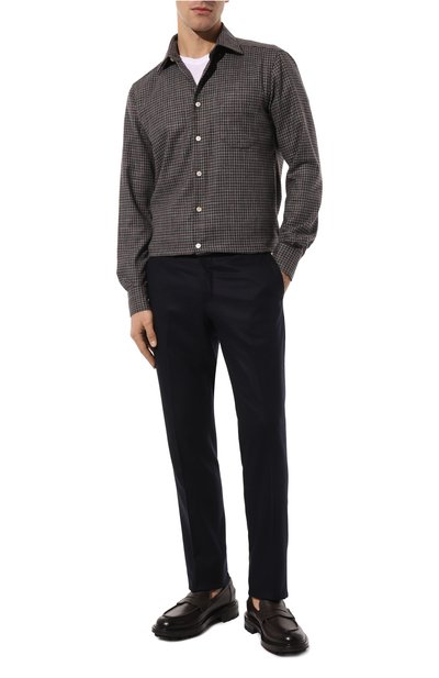 Рубашку с парными складками на спинке сшили из клетчатой шерстяной ткани с добавлением шелка и хлопка. Модель с нагрудными карманами и фигурными манжетами застегивается перламутровыми пуговицами.