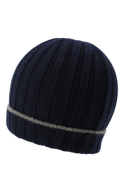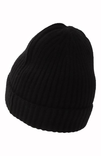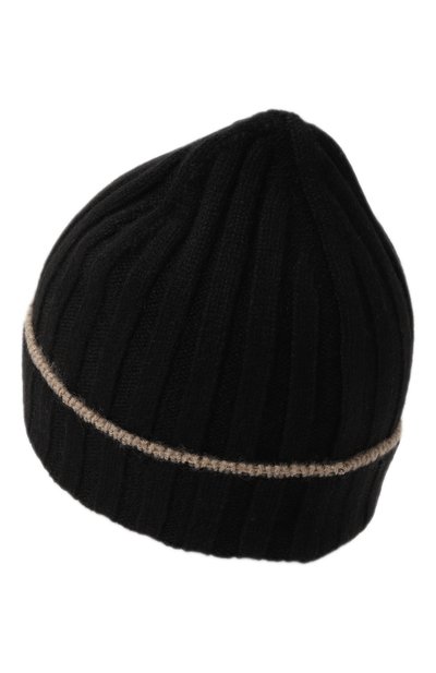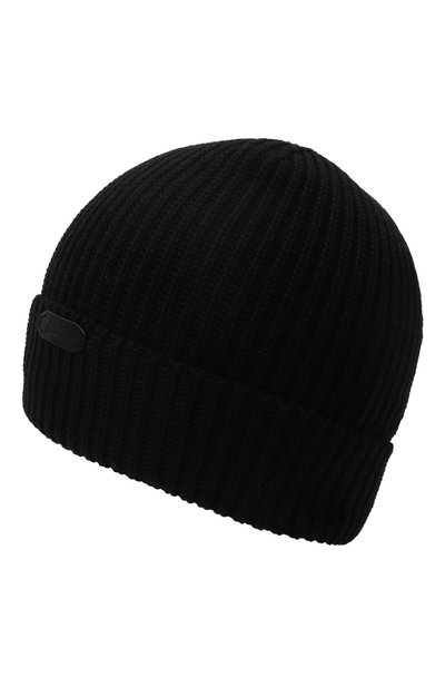 Шапку бини в широкую рифленую полосу связали из кашемировой пряжи. Отворот в рубчик украсили жаккардовым логотипом марки.