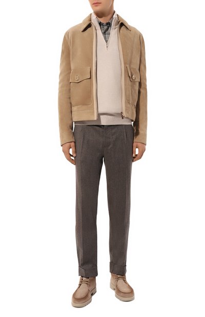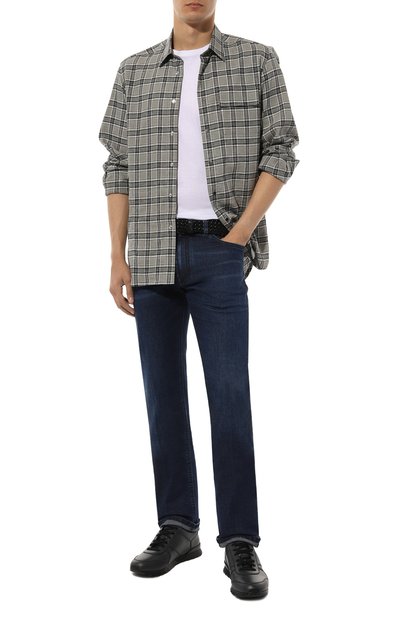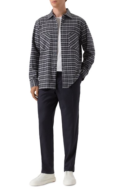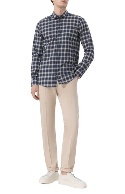 Клетчатую рубашку с закругленной линией низа сшили из хлопковой фланели. Сама модель, как и манжеты со срезанным углом, застегивается пуговицами из перламутра австралийской устрицы Pinctada Maxima.