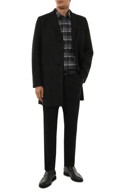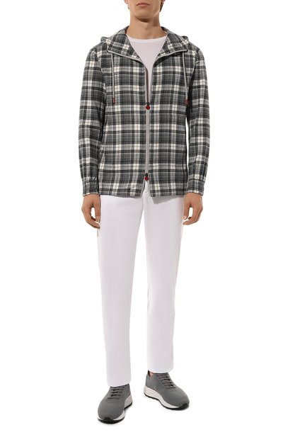 Рубашку со скошенными манжетами сшили из хлопковой фланели в клетку тартан. Нагрудный карман закрепили стежками фирменного алого оттенка.