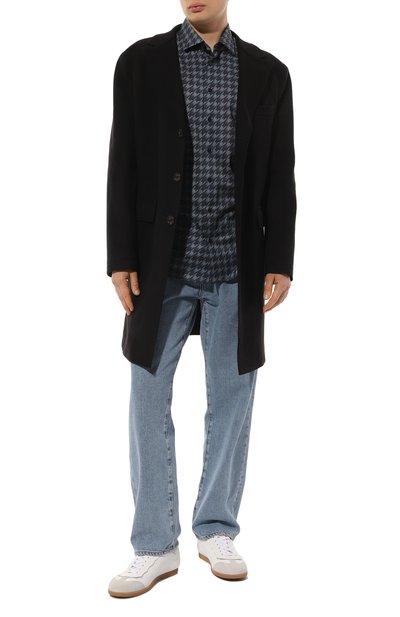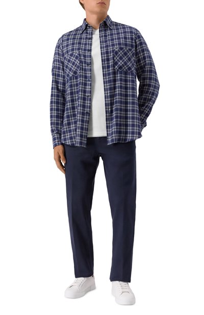 Рубашку со скошенными манжетами сшили из хлопковой ткани в клетку. Модель дополнили нагрудным накладным карманом со стежками фирменного алого оттенка.