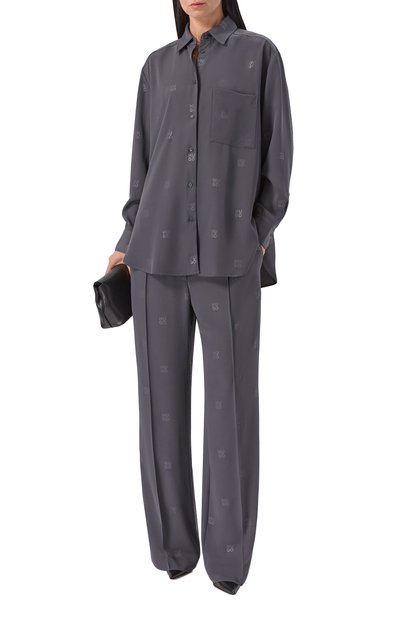 Широкие брюки с парными складками спереди выполнили из напоминающего фланель стрейчевого трикотажа на основе полиэстера и шерсти. Модель с эластичным поясом дополнили боковыми и задними карманами.