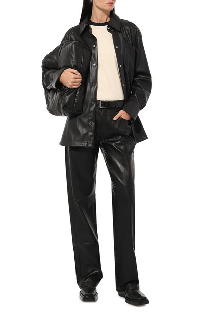 Зауженные брюки с двумя парами карманов выполнили из стрейчевого полиэстерового трикотажа с полиуретановым покрытием, напоминающим лакированную кожу с эффектом кракелюра. Пояс со шлевками продублировали узким регулируемым ремнем с квадратной пряжкой.