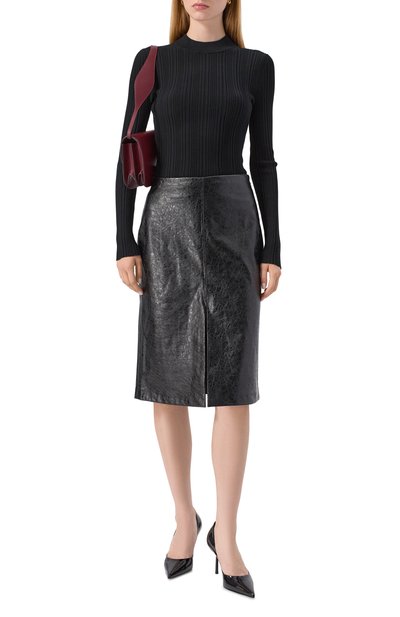Юбку-карандаш со шлицей сзади и потайной молнией спереди дополнили выступающими над поясом шлевками с продетым узким ремешком. Модель выполнили из полиэстерового джерси с покрытием, имитирующим лакированную кожу.