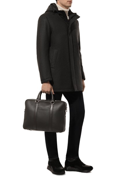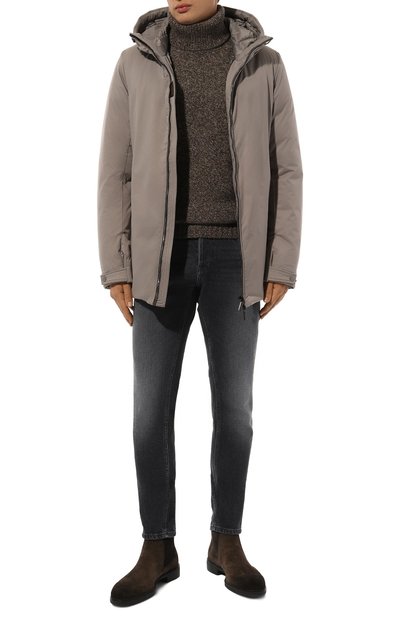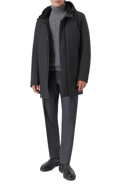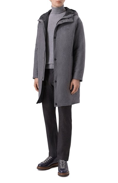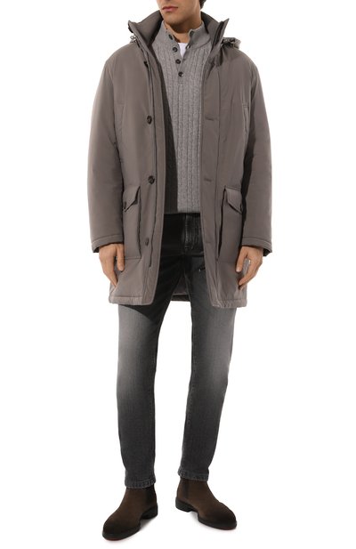 Парку с трикотажным воротником-стойкой и съемным капюшоном сшили из шерсти с добавлением кашемира. Стеганую модель с тонким слоем синтетического утеплителя дополнили двумя накладными карманами с клапанами и парой врезных на молниях.