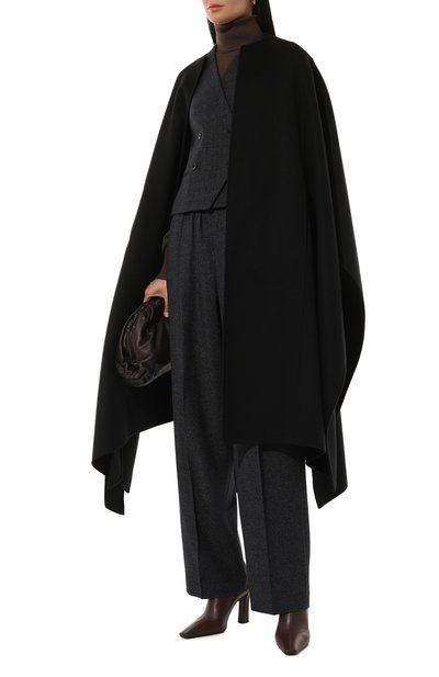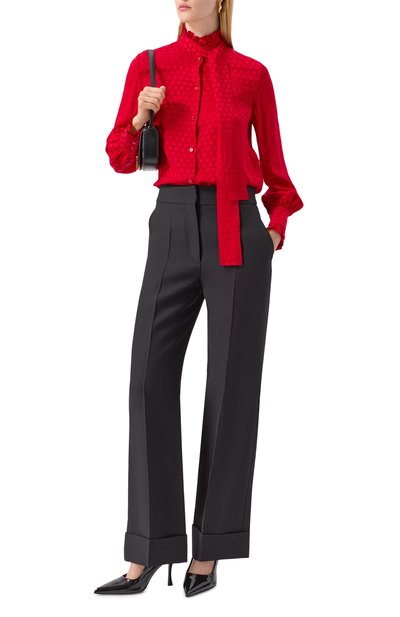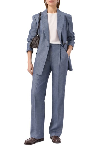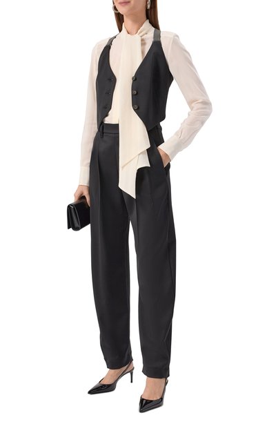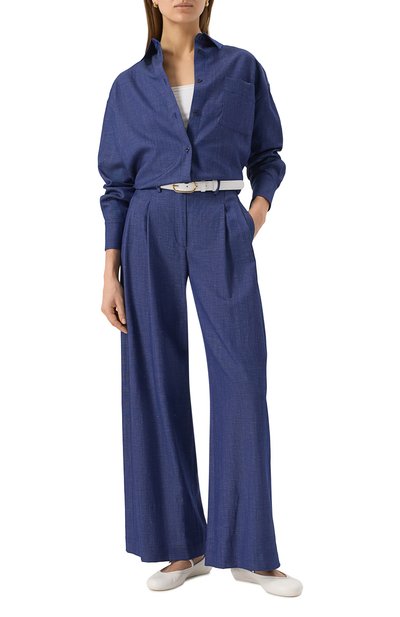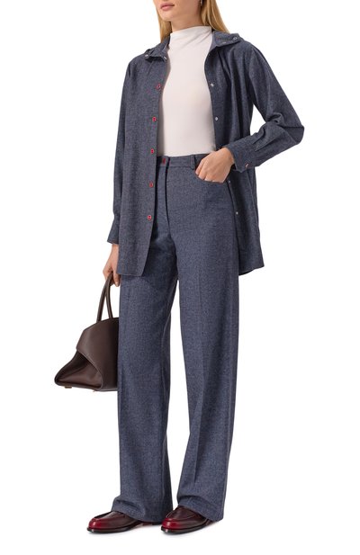 Для пошива брюк с высокой посадкой использовали кашемировую фланель. Модель с широким поясом со шлевками дополнили двумя врезными карманами.