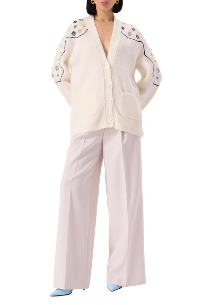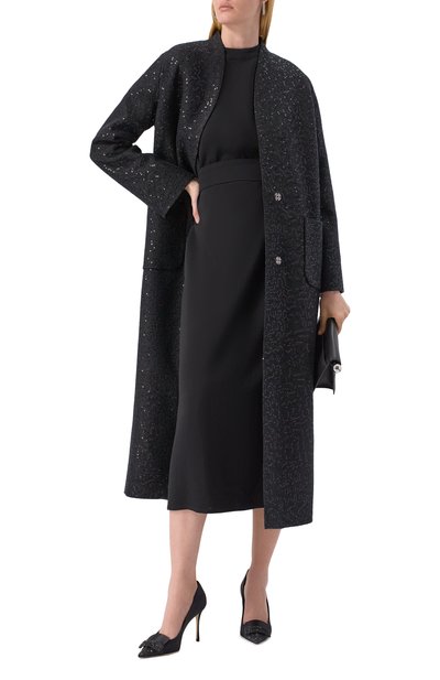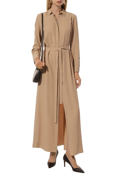 Туфли-лодочки с зауженным мысом, на высокой шпильке изготовили из гладкой телячьей кожи. Асимметричный вырез модели подчеркнули перемычкой с металлической брендированной накладкой.