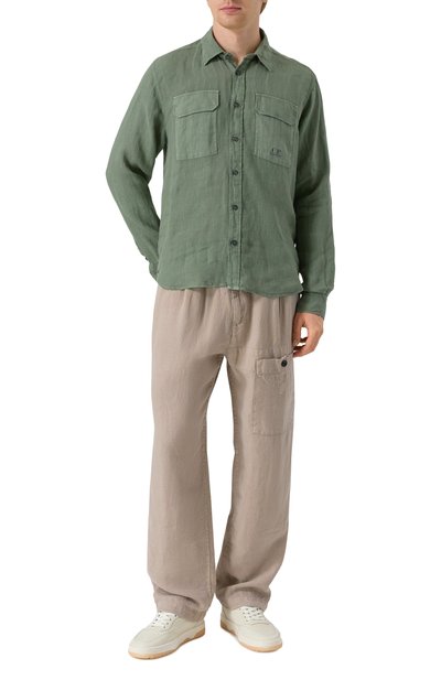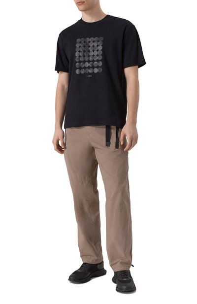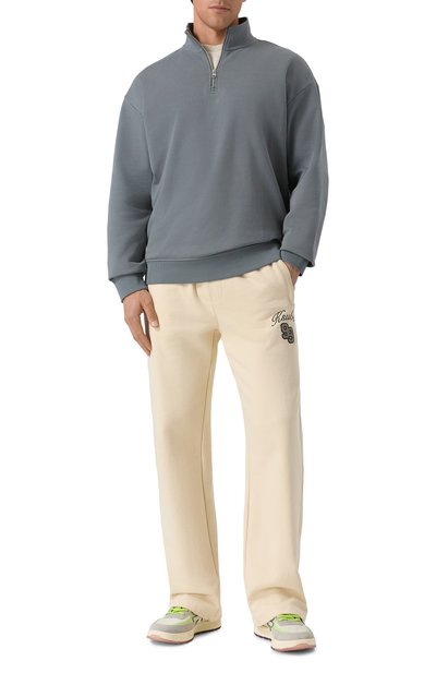 Широкие брюки с внутренней кулиской на поясе выполнили из хлопкового трикотажа Shrink Free плотностью 11,5 унций. Окрашенную в готовом виде модель с накладным задним и врезными боковыми карманами декорировали вышитым логотипом.