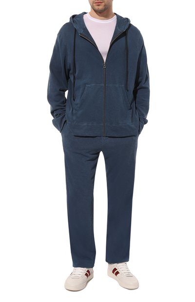 Для изготовления толстовки с манжетами и поясом в рубчик и нерегулируемым капюшоном использовали хлопковый флис Shrink Free. Окрашенную в готовом виде модель с парой накладных карманов декорировали логотипом спереди и графическим принтом International на спинке.