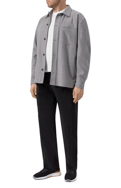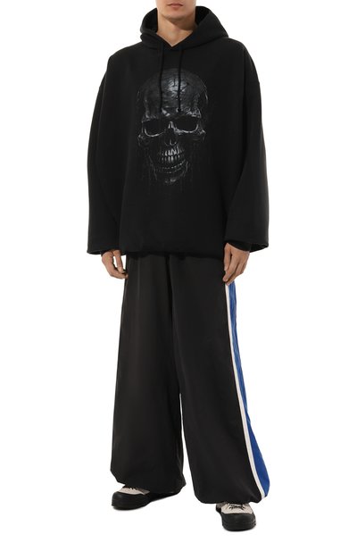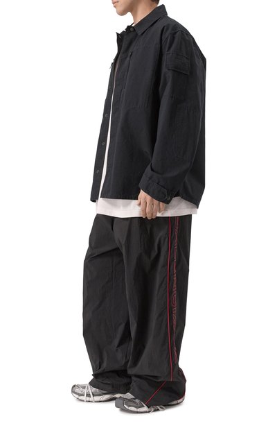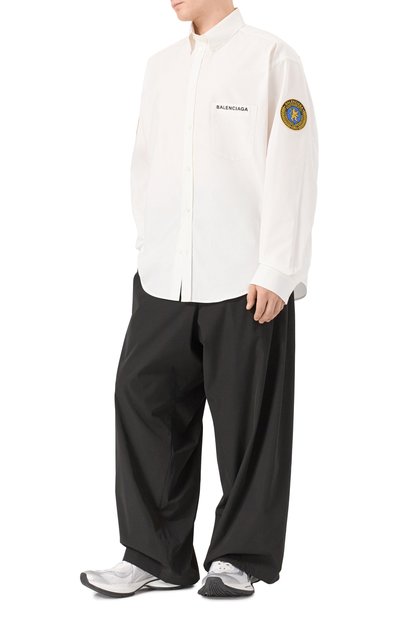 Для создания широких брюк с двумя карманами и эластичным поясом использовали хлопковый поплин с добавлением полиамида. В цвет контрастных вставок по бокам вышили фирменную эмблему 3B.