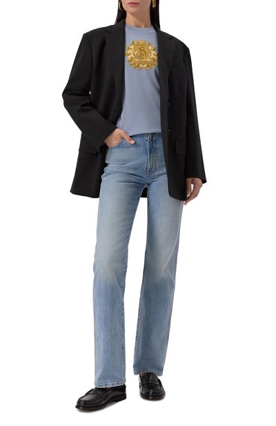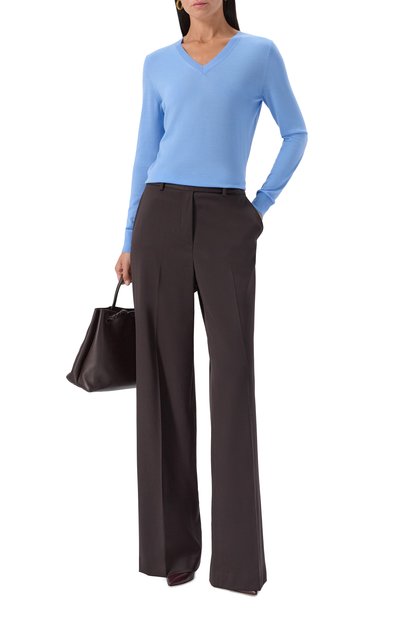 Для изготовления лаконичного поло использовали трикотаж из мериносовой шерсти диаметром 13,5 микрон. Отделку V-образной горловины, пояс и манжеты модели выполнили в рубчик.