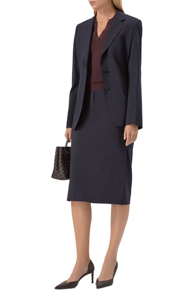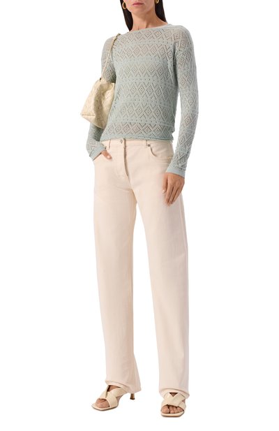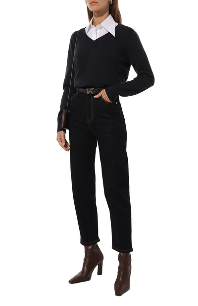 Для изготовления лаконичного поло использовали трикотаж из мериносовой шерсти диаметром 13,5 микрон. Отделку V-образной горловины, пояс и манжеты модели выполнили в рубчик.