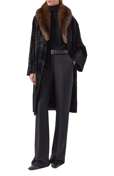 Для изготовления шубы с шелковым подкладом использовали каракульчу свакара. Модель со шлицей сзади и боковыми карманами дополнили супатной застежкой.