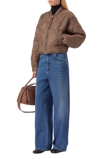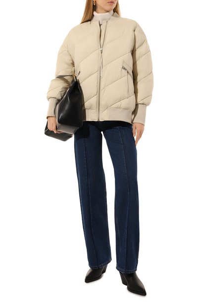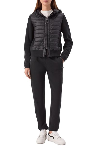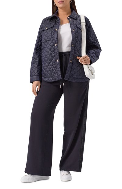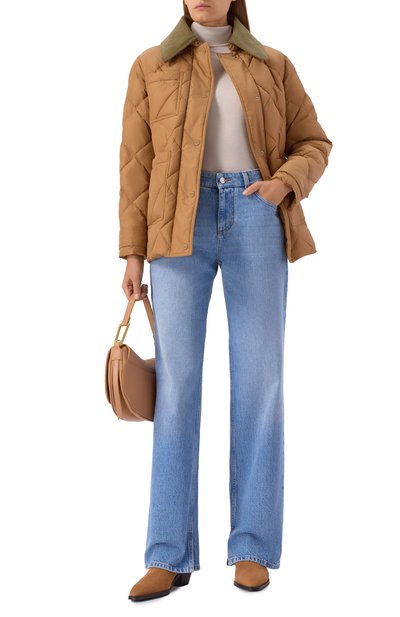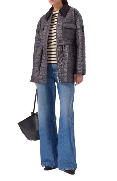 Стеганую куртку с вельветовым воротником сшили из переработанного нейлона. Рукав украсили фирменным патчем. Утепленная модель с двумя парами карманов застегивается встречной молнией, скрытой под планкой с кнопками.