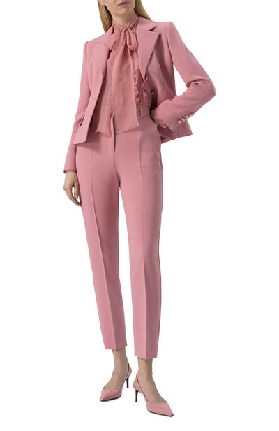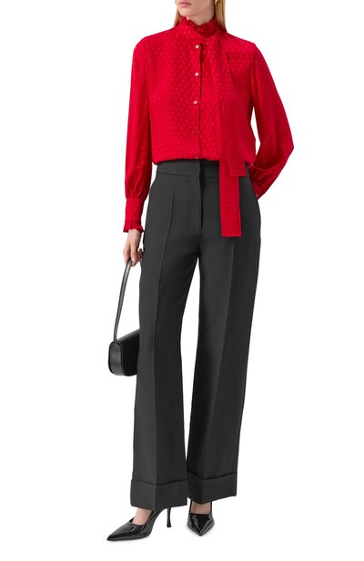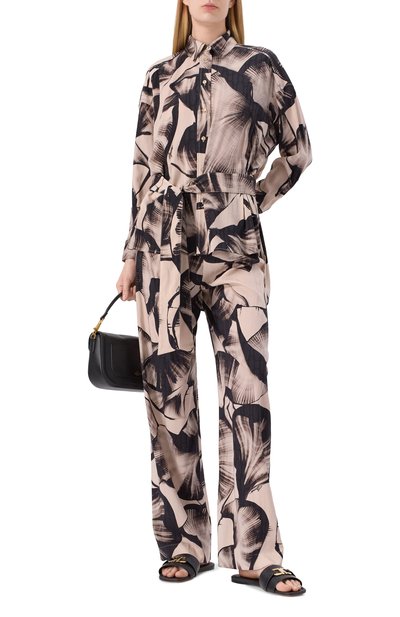 Блузку с закругленным низом выполнили из полупрозрачного шелка с абстрактным мотивом. Модель с супатной застежкой дополнили воротником аскот.