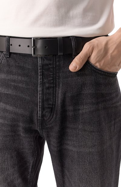 Для создания ремня с двумя строчками фирменного алого оттенка использовали гладкую кожу. Прямоугольную пряжку из сатинированного металла украсили выгравированным логотипом марки.
