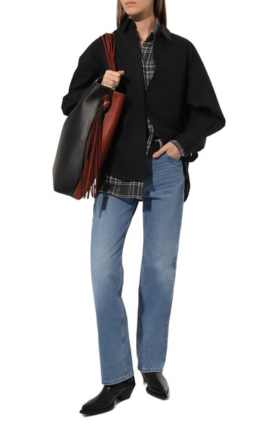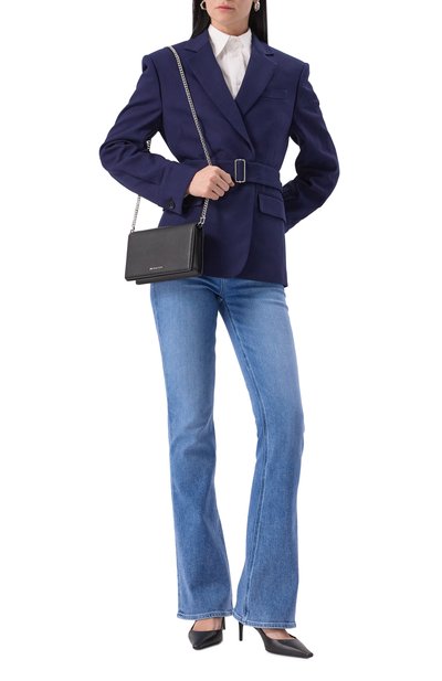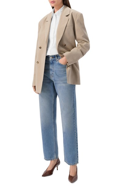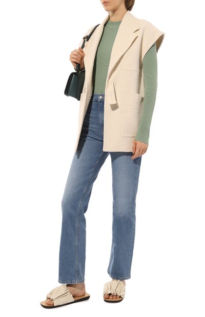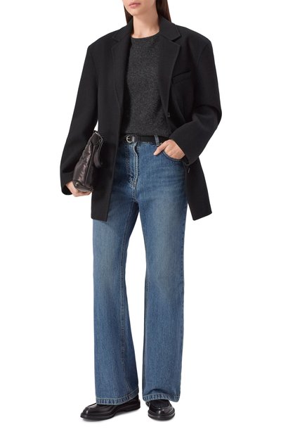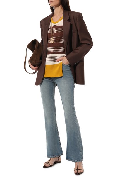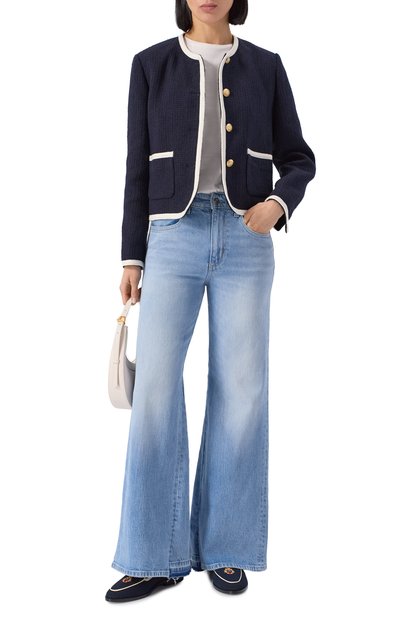 Слегка расклешенные джинсы с пятью карманами выполнили из хлопкового денима с добавлением эластана. Пояс модели сзади дополнили брендированным патчем.