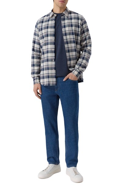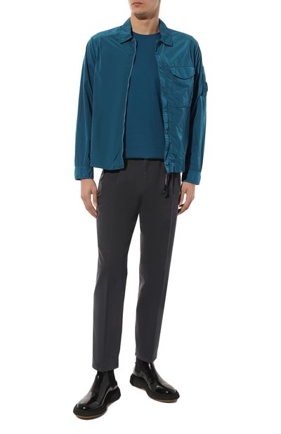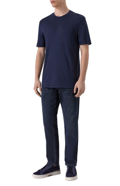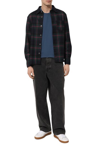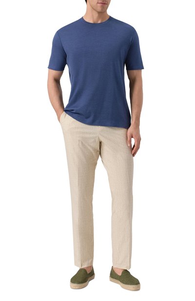 Однотонная футболка прямого кроя органично впишется в базовый гардероб. Для изготовления модели с контрастным кантом на горловине использовали фактурный мерсеризованный трикотаж из хлопка и нейлона.