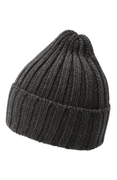 Шапку бини связали рельефным узором из кашемира. Принадлежность модели марке подчеркнули контрастным логотипом на широком отвороте в рубчик.