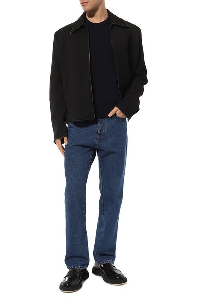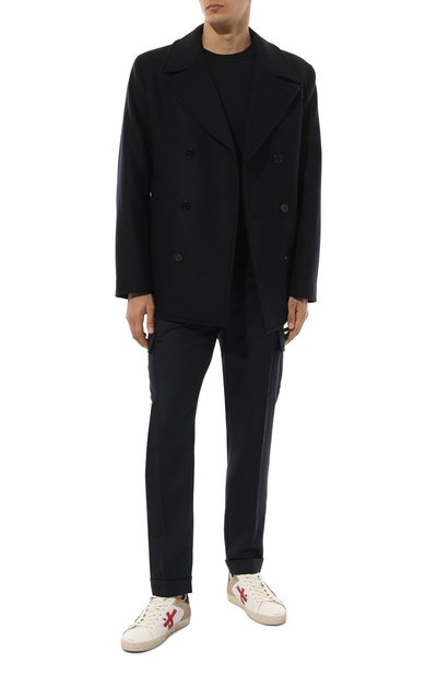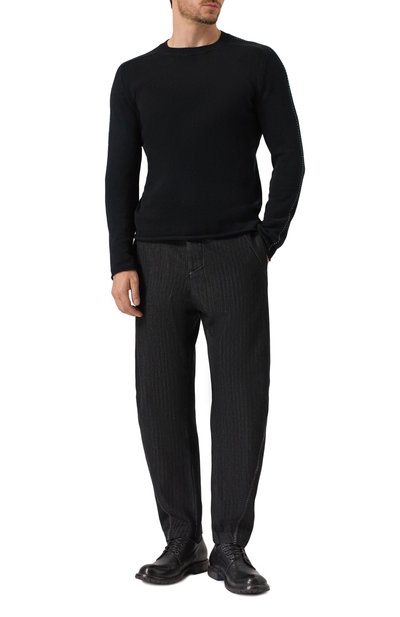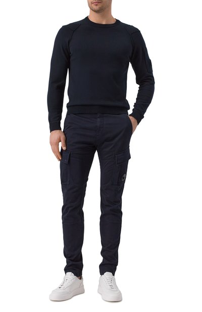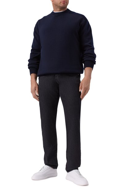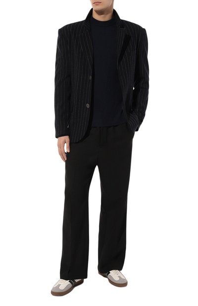 Джемпер с фактурными вставками в тон на плечах и по бокам связали плотностью 12 петель на дюйм из шерсти первого пострига с добавлением полиэстера. Рукав модели дополнили фирменным съемным патчем.