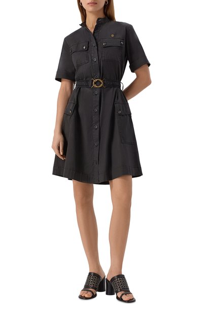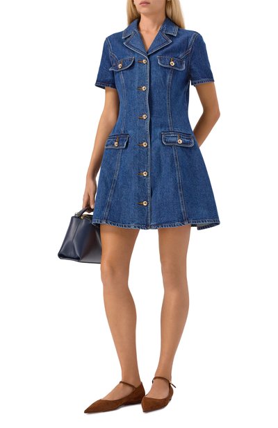 Для создания короткого платья-рубашки Clementine использовали слегка эластичный деним из органического хлопка. Модель на пуговицах с тиснеными логотипами дополнена двумя накладными карманами, украшенными металлическими пряжками.