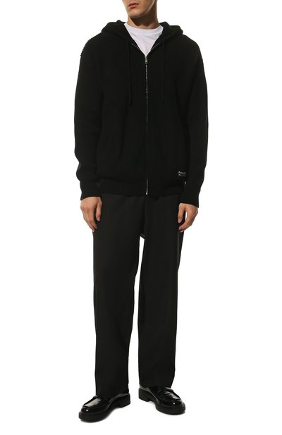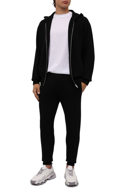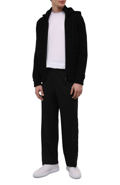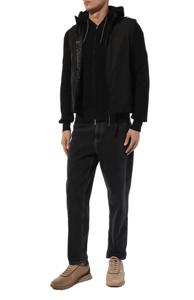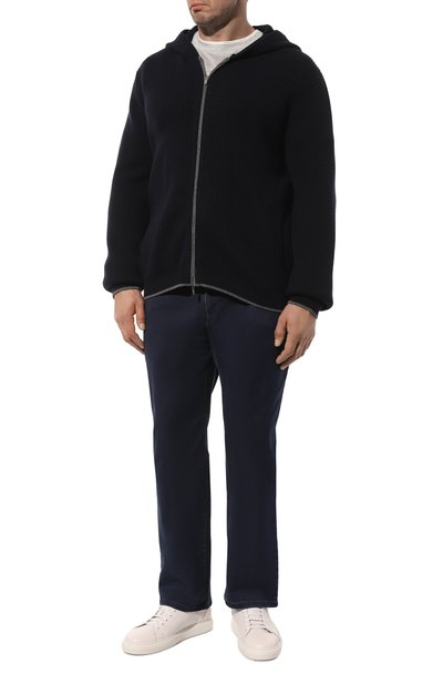 Кардиган из кашемирового трикотажа дополнили капюшоном и боковыми карманами. Модель с контрастной внутренней отделкой манжет и пояса в рубчик застегивается встречной молнией.