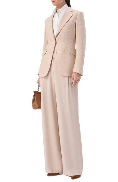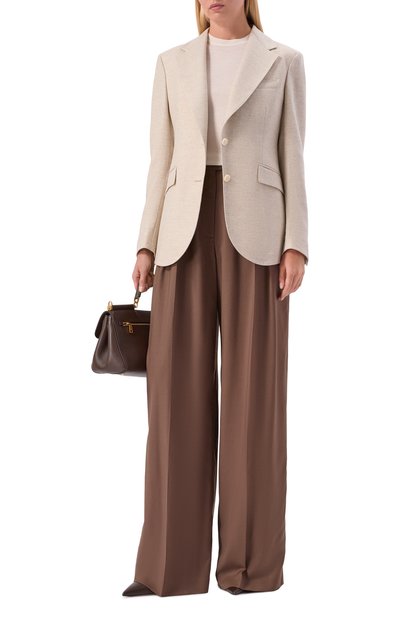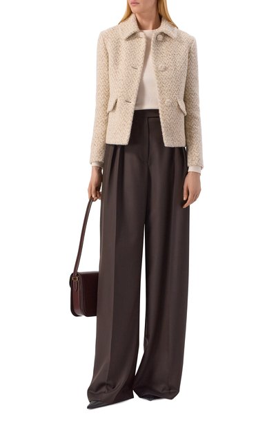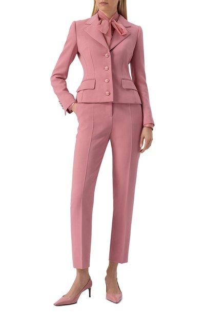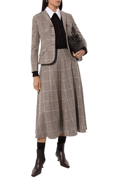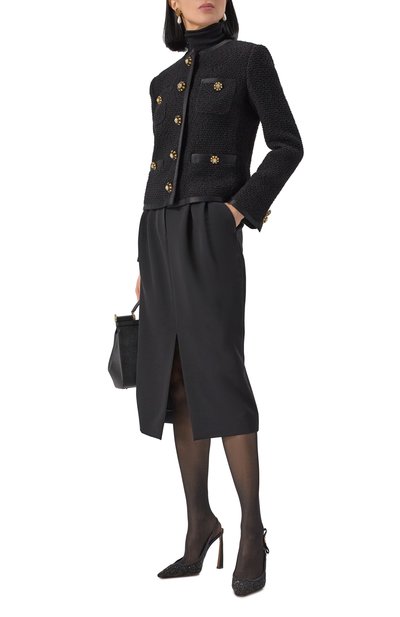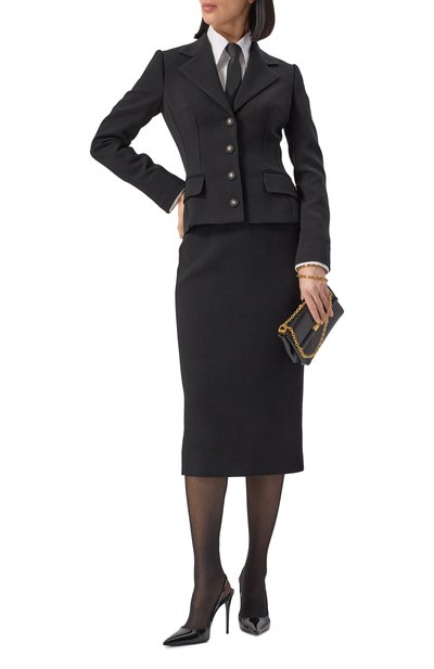Жакет с накладными нагрудными и боковыми карманами составит элегантный дуэт с парной миди-юбкой. Приталенную модель выполнили из ворсованного кашемира, выбрав для подклада шелковый твил.