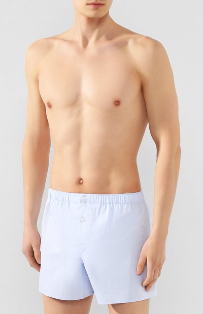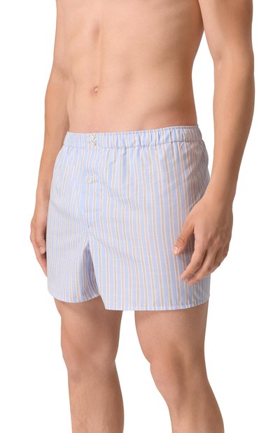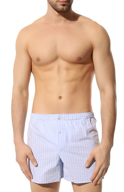 Боксеры из коллекции Cotton Poplin Print выполнили из гладкого хлопкового поплина с геометрическим паттерном. Трусы с короткими боковыми разрезами и эластичным поясом дополнили гульфиком с пуговицей.