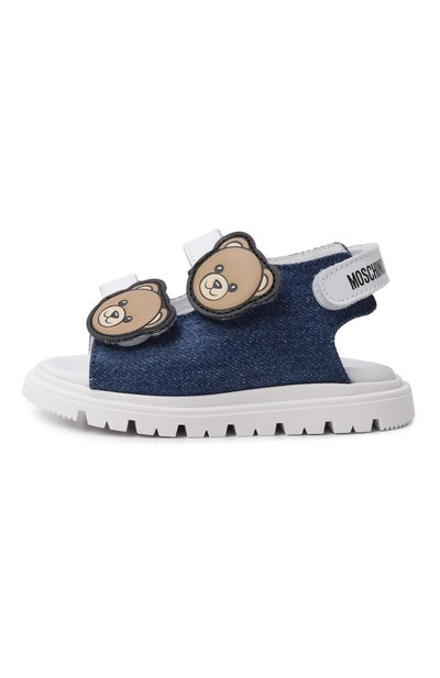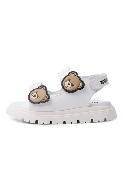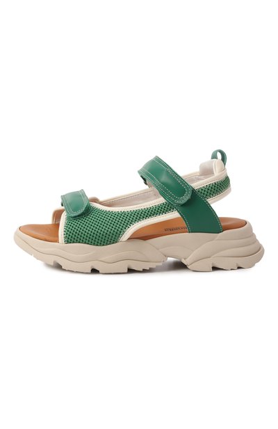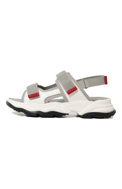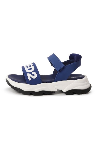 Сандалии с брендированными ремешками велкро выполнили из кожи и полиуретана. Модель установили на массивную контрастную подошву из резины.