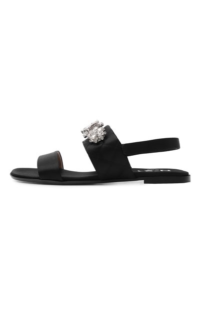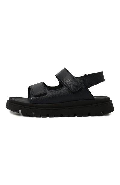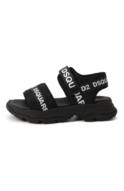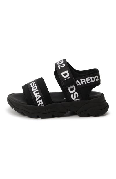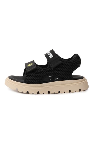 Сандалии на скульптурной протекторной подошве изготовили из эластичного текстиля. Модель застегивается тремя регулируемыми ремешками велкро из кожи, украшенными контрастными логотипами марки.