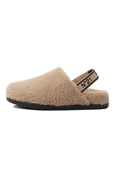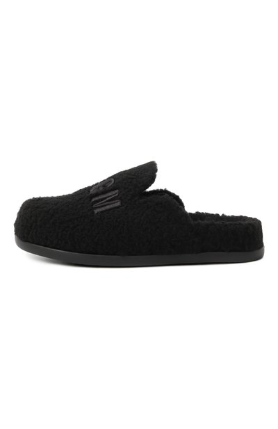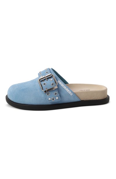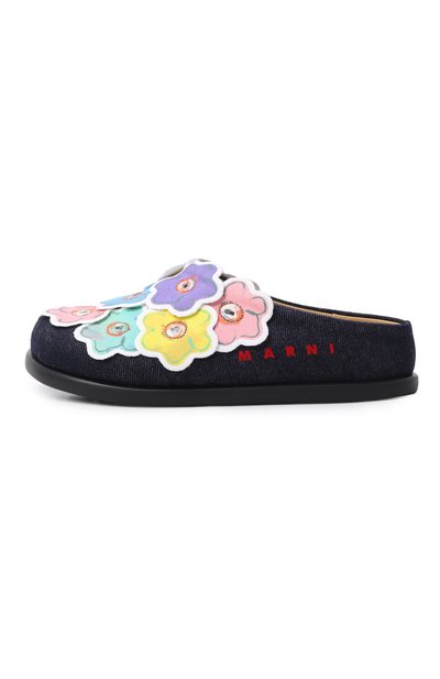 Сабо с внутренней отделкой из гладкой кожи выполнили из плотной ткани, напоминающей деним. Модель на резиновой подошве декорировали цветочными аппликациями.