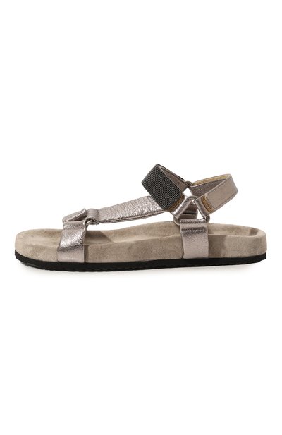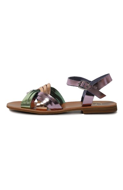 Для изготовления сандалий с ажурной союзкой использовали гладкий полимерный материал с зеркальным блеском. Модель на тонкой подошве со стелькой из металлизированной кожи застегивается сбоку ремешком с квадратной пряжкой.