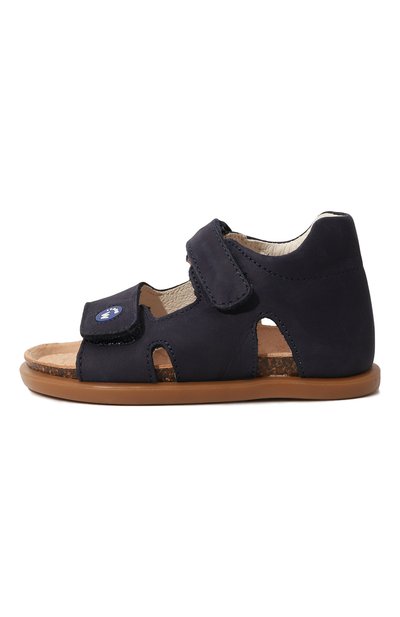 Для создания сандалий с рельефной резиновой подошвой использовали матовую кожу. Формованную стельку отделали замшей. Посадка обуви с петлей на заднике регулируется ремешком с серебристой пряжкой.