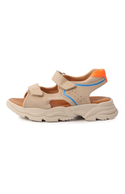 Сандалии на широкой протекторной подошве с формованной замшевой стелькой выполнили из нубука. Модель с петлей на заднике застегивается ремешком с пряжкой сбоку.