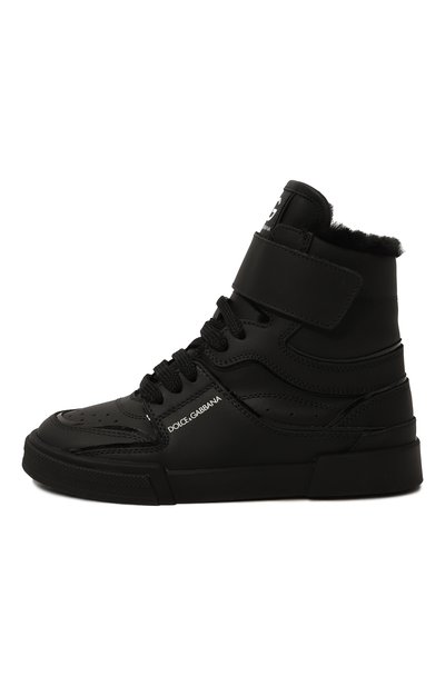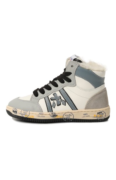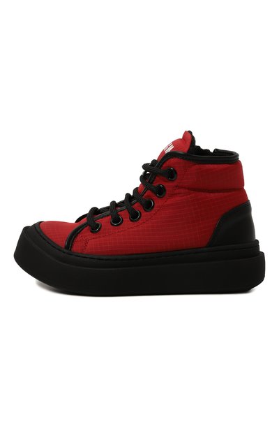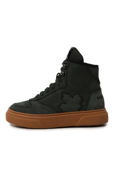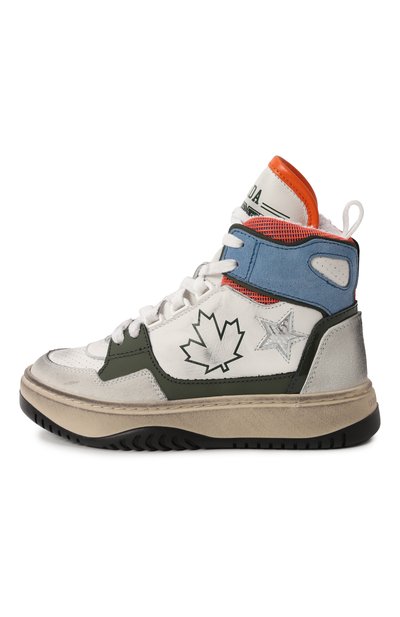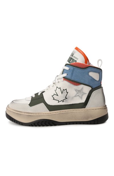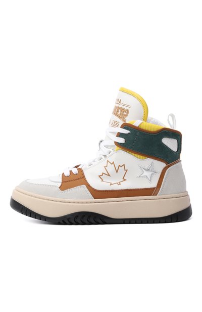 Высокие кеды из полиэстера укрепили деталями из замши и кожи. Модель с логотипом на язычке украсили изображением кленового листа и вставкой в форме звезды сбоку. Пара на широкой подошве, утепленная хлопковым френч-терри, застегивается молнией сбоку.