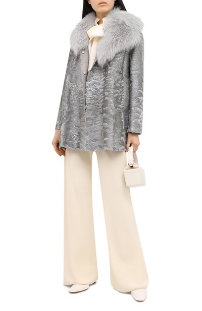 Шуба из меха козы застегивается наглухо контрастными ремнями из мелкозернистой кожи. Модель с боковыми карманами дополнили подкладом из вискозы с добавлением шелка.