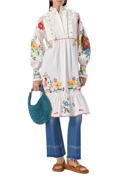 Сандалии Diana выполнили из текстиля и кожи. Узкие ремешки, один из которых застегивается миниатюрной пряжкой сбоку, и рант выступающей подошвы вручную декорировали стразами.