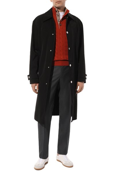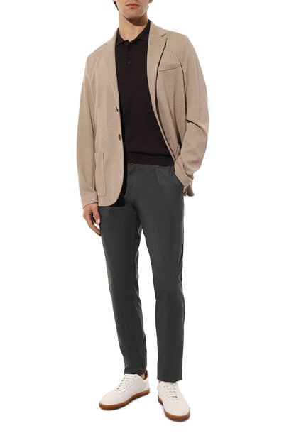 Брюки с эластичным поясом-кулиской выполнили из чистой шерсти. Модель дополнили боковыми и задними накладными карманами, один из которых украсили вышитой фирменной эмблемой.