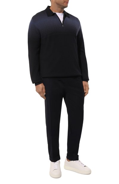 Для изготовления поло с жаккардовым геометрическим узором спереди использовали пряжу из кашемира и шелка. Модель с отделкой в рубчик застегивается короткой молнией с брендированным пуллером.