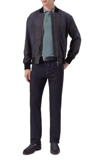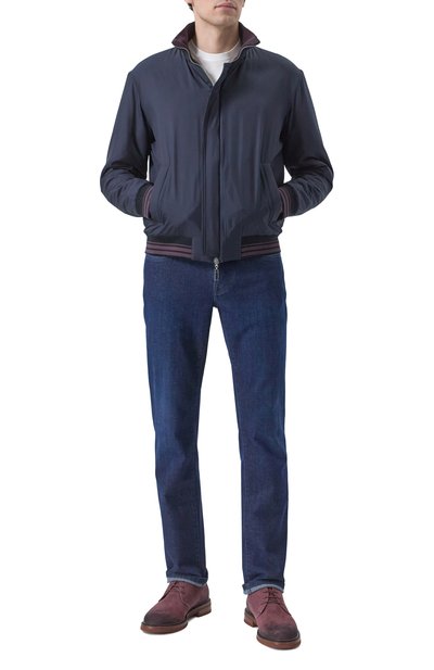 Утепленный бомбер в мелкую клетку выполнили из микса полиэстера, шелка и полиуретана, выбрав для подклада чистый кашемир. Швы на спинке и рукавах, а также встречную молнию с фирменными пуллерами укрепили кожей. Куртку с трикотажными манжетами, поясом и воротником дополнили боковыми карманами.
