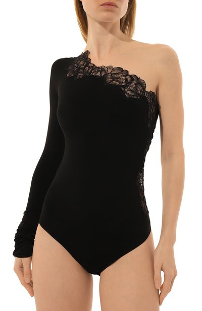 Полупрозрачное боди выполнили из эластичного сетчатого полиамида с анималистичным мотивом. Модель с длинными рукавами и воротником-стойкой застегивается плоскими кнопками внизу.