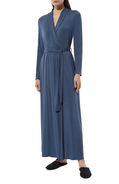 Для пошива халата с двумя врезными карманами и поясом-лентой использовали струящееся джерси из модала. Шалевый воротник модели украсили контрастными полосками сзади.