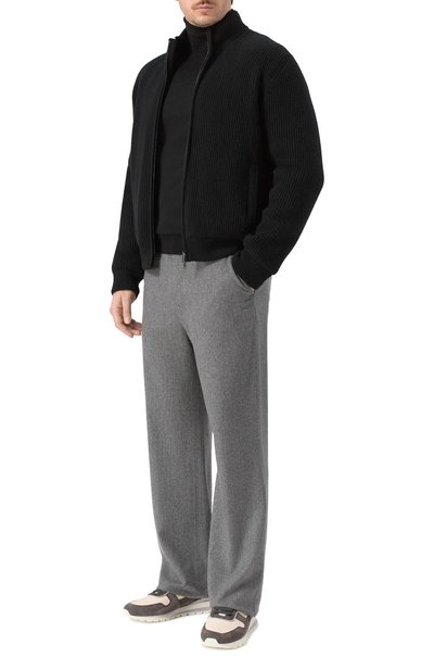 Брюки со стрелками дополнили двумя парами карманов. Для изготовления модели использовали фланель из микса шерсти и кашемира.