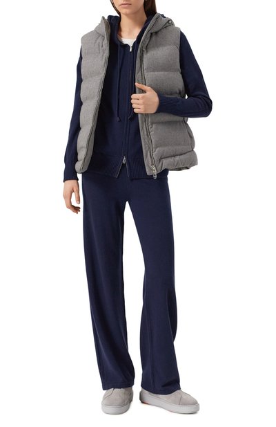 Толстовку выполнили из гладкого трикотажа на основе кашемира и шелка. Модель со спущенной линией плеч и регулируемым капюшоном застегивается встречной молнией.