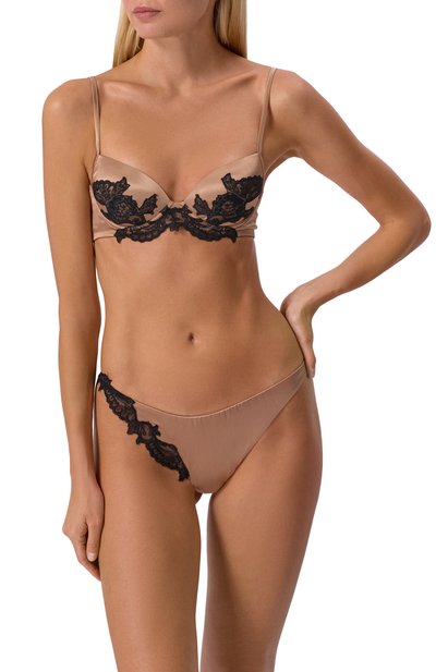Стринги с низкой посадкой выполнили из эластичного шелкового атласа. Трусы с плоскими незаметными швами украсили контрастным кружевом с цветочным мотивом.
