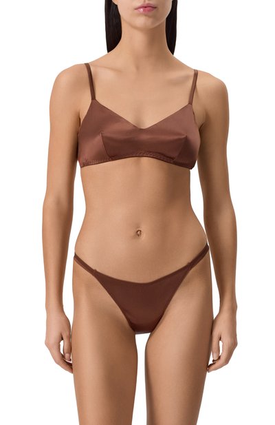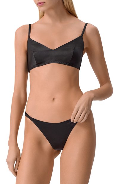 Для изготовления стрингов использовали блестящий шелковый атлас стрейч. Спереди и сзади трусы декорировали вставками из фактурного цветочного кружева.