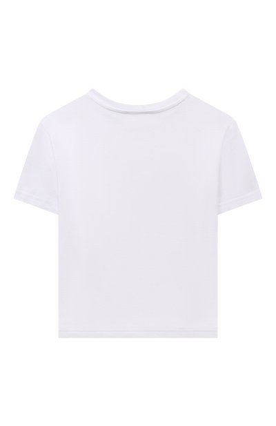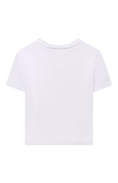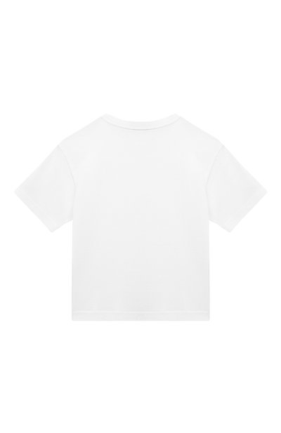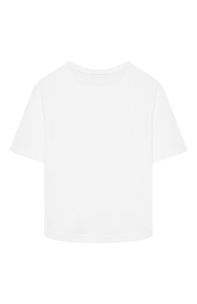 Для изготовления футболки с круглым вырезом использовали хлопковое джерси. Спереди модель прямого кроя декорировали кожаной нашивкой с фирменной двухслойной пластиной.