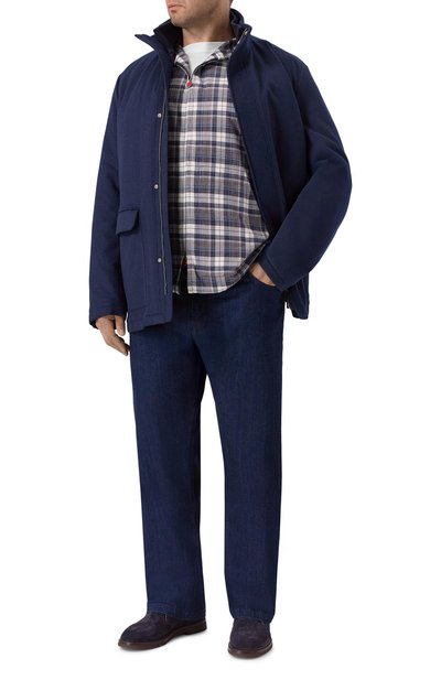Для создания куртки со шлицей сзади и молниями на рукавах выбрали чистый шелк. Спинку и полочки утеплили овчиной, подчеркнув таким же мехом отложной воротник, а молнию, скрытую под штормовой планкой на кнопках, укрепили кожей оленя. Помимо нагрудных и боковых карманов предусмотрели еще пару внутренних.