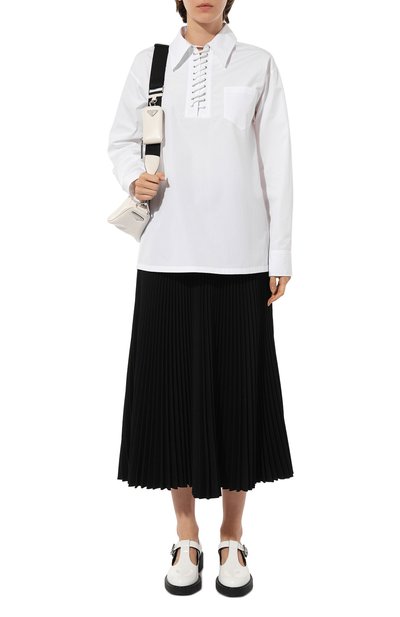 Рубашку со слегка спущенной линией плеч выполнили из хлопкового поплина. Модель с закругленной линией низа застегивается перламутровыми пуговицами.